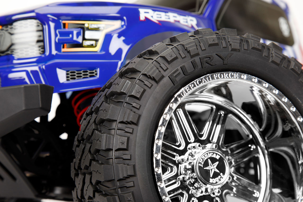 Reeper American Force Edition HobbyWing 150A 1450kV Brushless Motor Savox 12kg Servo Adjustable Battery Trade American Force Wheels legend SS8 Plastic Fury Off Road Mountain M/T American Force Legend SS8 with additional +10mm than standard Reeper wheels. Wide stance