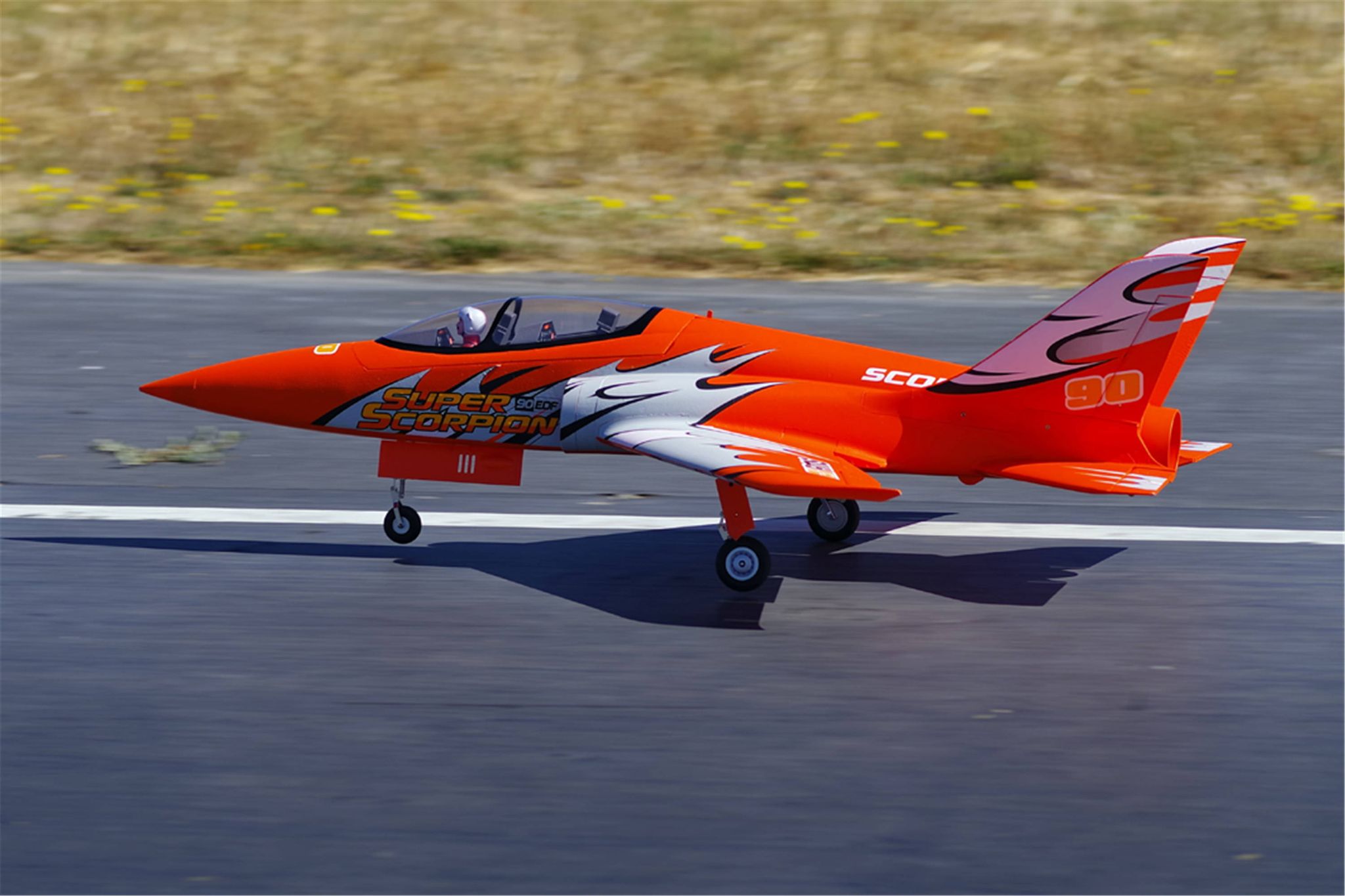 The 90mm Super Scorpion keeps all superior features of the prior 70mm Super Scorpion, while improving the model structure, and adding a flap function. When working with the new power system, it performs excellently whether high-speed flying or standard-speed flying. In addition, it features the CNC-processed shock-absorbed metal landing gear set, a 50mm diameter front wheel and 68mm diameter rear wheels, these are excellent for taking off and landing on both paved and grass surface airfields.