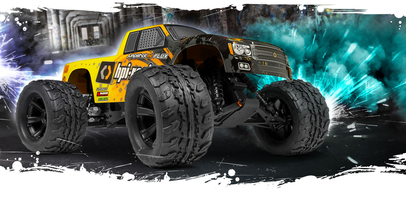 The Jumpshot MT FLUX drives and performs fantastic right out of the box, however if you want to, it’s easy and quick to adjust plenty of settings, exactly like a real monster truck! Adjustments such as ride height, shock angle and more are merely a turn away with your fingers or a wrench if you want to dive under the hood – HPI make it easy to be your own monster truck mechanic AND driver! More complex adjustments such as camber settings can be done with option parts you can get from your RC hobby shop.
