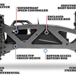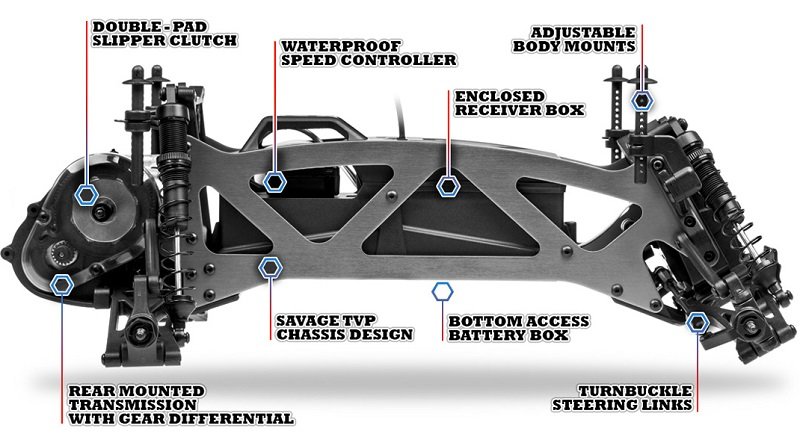 The Jumpshot MT V2 is built just like the legendary and award-winning Savage, with a TVP (Twin Vertical Plate) lightweight aluminum chassis that runs from the front to the rear. Sandwiched between the chassis plates are the battery and electronics boxes, plus the steering module and transmission with the suspension mounts. This makes the Jumpshot MT V2 extra-strong and super durable so you can have fun for hours and hours!