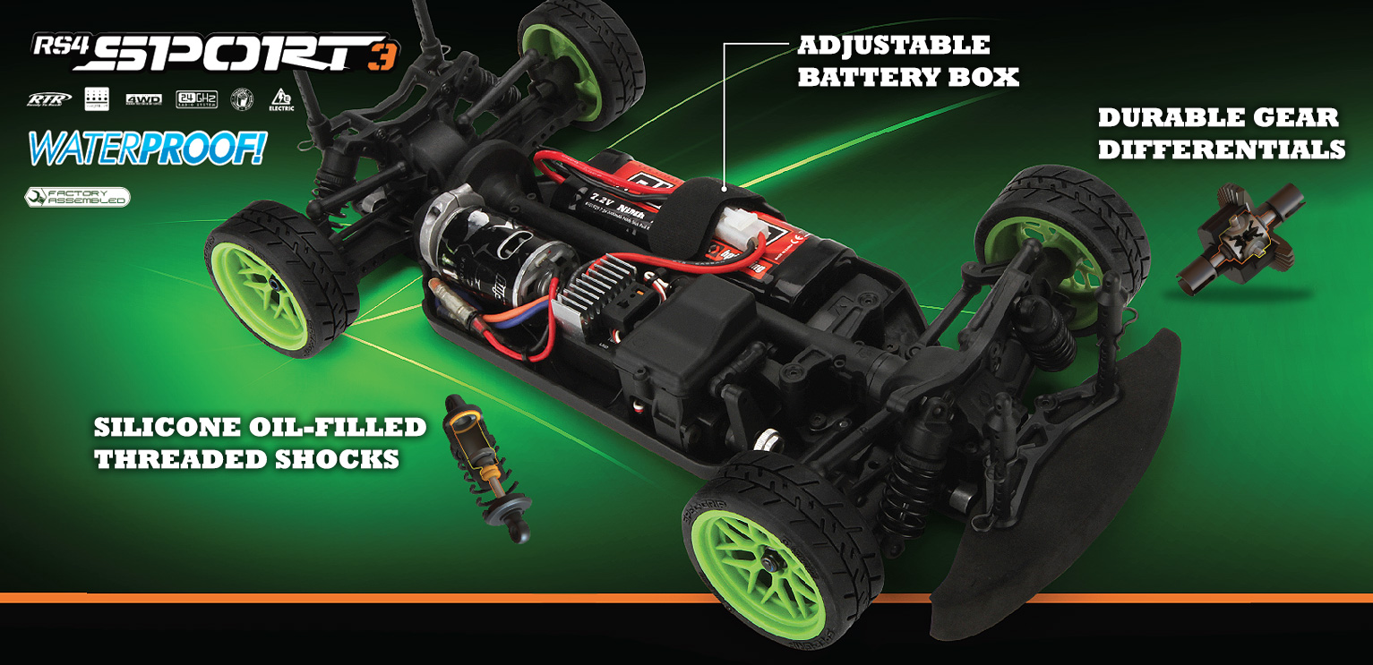 HPI RS4 SPORT 3 RTR MUSTANG RTR SPEC 5 RS4 Sport 3 Featuring the 2015 Ford Mustang with RTR Spec 5 tuning Introducing the brand new HPI Racing 2015 Ford Mustang RTR Spec 5 RS4 Sport 3! Bringing the awesomeness of Vaughn Gittin Jr’s RTR Spec 5 into your hands in 1/10th scale RC form, the latest RS4 Sport 3 kit is Ready to Rock your RC world! The super realistic Ford Mustang RTR Spec 5 body is coupled with a set of replica HRE Tech 7 wheels for over the top scale realism. Under the hood, this 1/10th scale Mustang is equipped with the latest HPI Racing Touring Car chassis, the RS4 Sport 3. With full time shaft driven 4WD, a fully sealed drivetrain, waterproof 2.4 GHz electronics/radio gear, fully independent double wishbone suspension and adjustable oil filled shocks it’s Ready to Rock in any condition. To grab the attention of all RC and motorsport enthusiasts, this RS4 Sport 3 features the latest Ford Mustang styling, tuned and tweaked by drift champion Vaughn Gittin Jr. to become the awesome Ford Mustang RTR Spec 5. The car is also fitted with replica green RTR by HRE Tech 7 wheels wrapped with great-looking street tires, so it’s ready to hit the streets right out of the box! 1/10th Scale Pre-Assembled 4WD Touring Car with 2.4GHz Radio System and Painted Mustang RTR Spec 5 Body SPECIFICATIONS: Length: 431mm (17″) Height: 127mm (5″) Width: 200mm (7.9″) Wheelbase: 254mm (10″) Includes: 4 AA batteries 7.2v 2000 mAh NiMH battery with standard plug Wall battery charger