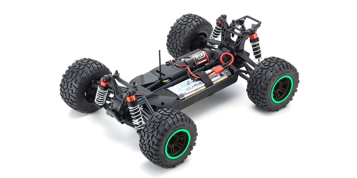 The Fazer chassis has gone through a full transformation. The all new Fazer Mk2 off-road FZ02L-BT chassis has been design for pure enjoyment on all kinds of terrains. Kyosho ‘maintains the RAGE’ with a huge evolutionary leap forward in the new SUV racing truck category, with the 2nd generation RAGE 2.0. While keeping the cost-performance advantages of the original, the RAGE 2.0 has been redesigned with this full-model makeover incorporating the latest racing tech. Core strength has been increased through new materials and ribbing with stiffeners on front and rear, while the simplified chassis design uses less parts to deliver maintenance efficiency and chassis rigidity. In addition, the symmetrical chassis design synergizes excellent front-rear balance through the suspension and tire traction with consistent linear controllability, irrespective of power source. Featuring slipper clutch, front & rear gear differentials, oil shocks and full ball bearing specs, the high durability and impact resistance of the RAGE 2.0 means drivers don’t need to hold anything back over rough roads. The Readyset package comes fully assembled and includes everything except charger and battery for the chassis, and batteries for the transmitter. The beauty of the RAGE 2.0 is you can enjoy the thrill of on-road speed and the dynamic off-road action in one almighty machine! ●New design shaft drive full-time 4WD buggy chassis(FZ02L-BT). ●Factory-assembled Readyset package only requires 4 x AA alkaline batteries for the transmitter and battery with charger for the chassis to start running. ●Equipped with 2-bevel grease-filled gear diffs on front and rear. ●Large size dog bones and cup joints realize superior reliability and durability. ●Belt mounting battery compartment allows various battery types to be used. ●Full ball bearings that reduce drive loss equipped throughout the drive system. ●Includes KS202W waterproof steering servo. ●New design body in the image of American Rock Racers, features a vivid printed color scheme with decals applied. ●Performance can be further enhanced by installing various optional parts.