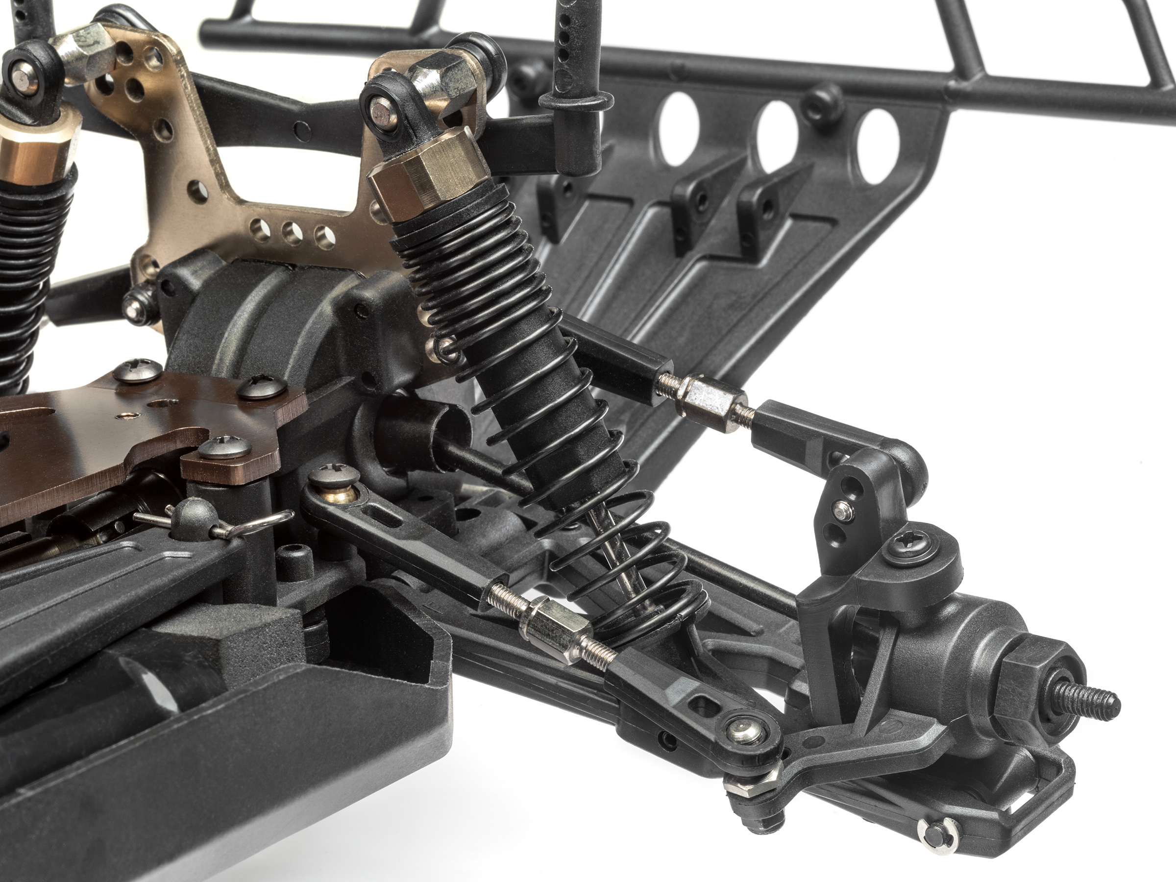 A powerful servo controls the steering through a racing-inspired bellcrank system. The dual-wishbone independent suspension front and rear use a reliable C-hub and steering knuckle design and single-piece rear hubs, meaning you can drive in any terrain with confidence and complete control.