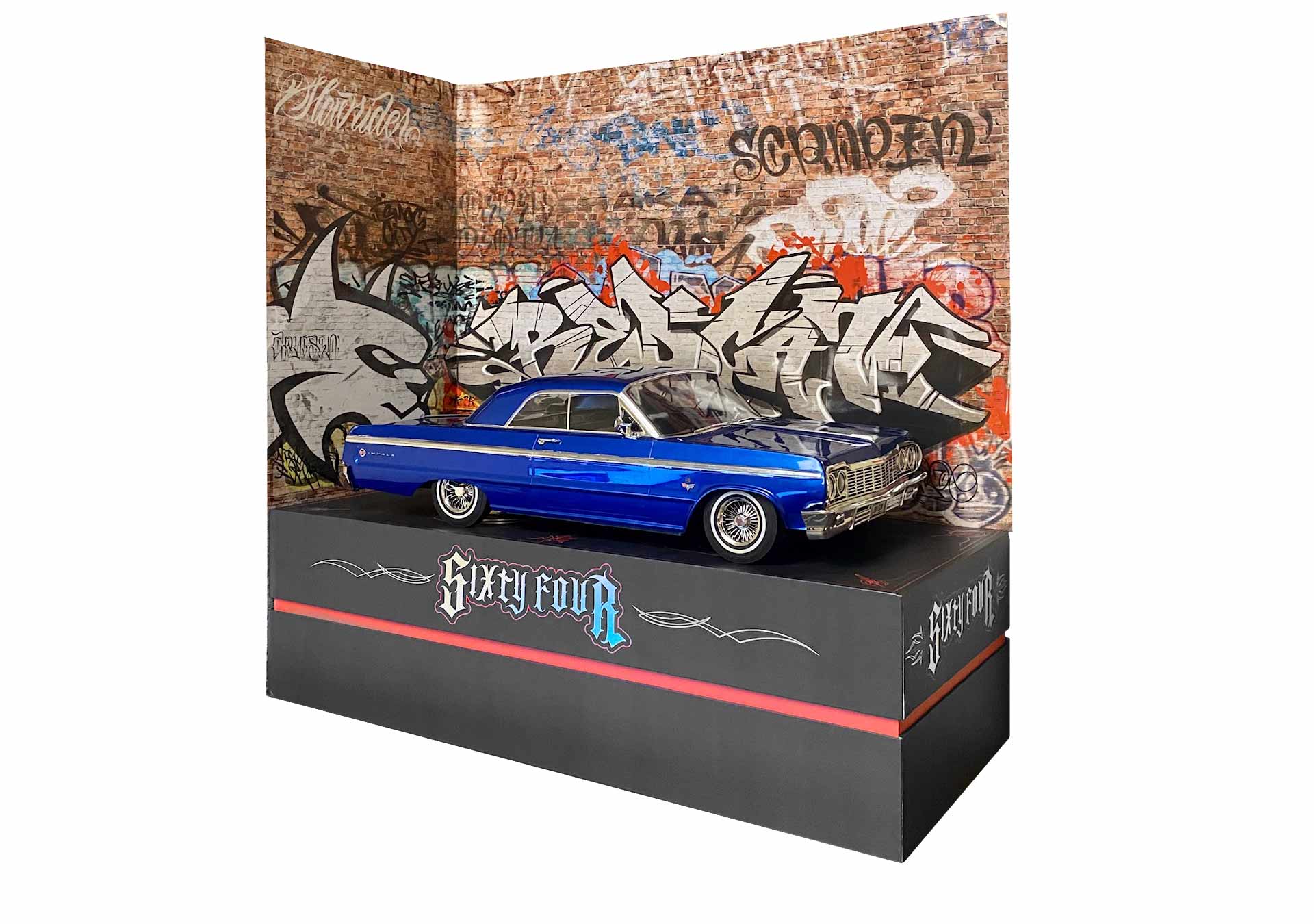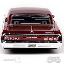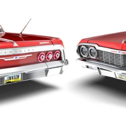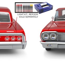 Every detail of the SixtyFour was painstakingly and passionately created with scale accuracy and detail. The Impala SS interior and exterior badging adorn the 1964 Impala SS body and interior. 23 individual chrome plated molded parts are used to create the body’s accessories. Optional LED lights are available for night time cruising. Clear windows feature high quality chrome foil trim to complete the ultra-realistic appearance. The attention to detail continues below the body, with the chassis frame, faux transmission and functional solid rear axle with removable differential cover.