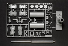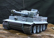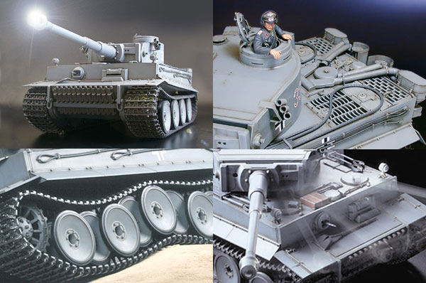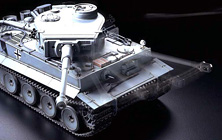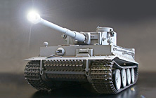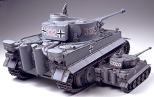 1/16 R/C German Tiger I Early Production Full-Option Kit (w/Detail-Up Parts) 【 Tiger in the Sand 】 This 1/16 scale limited edition R/C German Tiger I Early Production kit comes with extensive detail-up parts to enable realistic depiction of a tank that was deployed to the North African desert. Aluminum gun barrel and photo-etched grilles provide an enhanced level of realism. 2 types of parts for mantlet, air cleaners, and hatch underside are included. Of course, this model also features the various light and sound effects which Tamiya’s R/C tanks are famous for. ■Decals are included to depict 4 Russian front and 2 North African front tanks. ■The powerful 88mm gun barrel is realistically reproduced in aluminum. ■Highly-detailed rear section features photo-etched grilles. ■2 commander figures (1 wearing European uniform and 1 wearing desert uniform) are included. ■2 kinds of mantlet, air cleaners, and exhausts are also included. ■Photo-etched engine grilles provide an enhanced level of realism. ■During firing, the barrel-mounted LED flashes and firing sound roars from the onboard speaker. Realistic barrel and hull recoil movement are also reproduced. ■Turret can be rotated about 340 degrees. Gun barrel can be controlled within a 20 degree elevation range. Movement speed can be controlled by transmitter stick. ■Metal torsion bar suspension and pre-assembled resin tracks recreate realistic lumbering movement. Drive sprockets and idler wheels are made from die-cast metal. Road wheels feature rubber rings just like an actual tank. ■The large scale Tiger measures 530mm in overall length and features abundant detail. A comparison with the 1/35 scale Tiger gives you an idea of just how large it is. ■Turret rotation, gun barrel elevation/depression, and recoil mechanism unit sits compactly inside the turret. ■60mm diameter speaker box is installed at the rear of the hull and emits realistic sounds. ■Pre-assembled twin-motor gearbox features two RS-380 motors and a 59.77:1 gear ratio to maneuver the 4,100g model. ■DMD Control Unit controls forward/reverse, turning and pivot turning, as well as turret rotation and gun movement. Multi-Function Control Unit provides various lifelike sound effects. ■Requires 4-channel R/C system including a stick type transmitter, battery pack, and charger for operation (sold separately). 【 Click to see various lifelike actions 】 MOVIE ■Promotional Video (3min.) ・WMV File(46.7MB) ・MPEG File(26.2MB) MOVIE ■Basic Operation (1min.13sec.) ・WMV File(19.0MB) ・MPEG File(8.1MB) ★Main Gun Firing During firing, the barrel-mounted LED flashes, firing sound roars, and hull recoil movement is reproduced. An interval of about 9 seconds is required between each shot just like an actual Tiger. Control Fully raise the trim on right side and push right control stick forward. ★Turret Rotation, Gun Barrel Elevation/Depression Turret rotation and main gun elevation/depression are accompanied by realistic sounds. Control Move your left control stick left or right to rotate turret. Move the right stick up or down to raise or lower the gun barrel. ★Machine Gun Firing The hull-mounted 7.92mm MG34 machine gun fires continuously for 3 seconds. Control Fully lower the right trim and then pull the right control stick down. ★Realistic Movement Forward/reverse movement, turning, sharp turning, and pivot turning are all controllable. Torsion bar spring suspension offers realistic lumbering movement accompanied by engine sounds. Control Move the left stick up or down for forward and reverse. Move the right stick from left or right to make turns and pivots. 【 2 kinds of Engine Starting Sounds 】 Actual Tiger I tanks used an automatic engine starter or a manual crank to prevent battery over-discharging in cold areas. Tamiya’s R/C Tiger I also features these sounds. Turn on the transmitter first to hear manual crank start sound and turn the receiver first to hear automatic engine sound. For further realism, the model reproduces a manual crank start sound at low temperatures regardless of which unit is switched on first. 【 Authentic Engine Sounds 】 The only working King Tiger tank in the world is on display at the Saumur Tank Museum in France. Since the Tiger I used basically the same type of Maybach powerplant, Tamiya designers made their way to France to record all the sounds of this 700hp V12 powerplant, including battery start-up, crank start-up, fly-wheel sound, etc. in order to provide a greater level of enjoyment. ★Footage from engine sound recording MOVIE Watch the sound recording session at the Saumur Museum. The video contains the sound of an engine start-up and the engine back-fire sounds. ・WMV File(18.9MB) [ Windows Media Player ]※Streaming ・MPEG File(8.18MB) [ QuickTime ] 【 Specifications 】 ●1/16 Scale ●Length: 530mm ●Width: 232mm ●Height: 188mm ●Fully-Loaded Weight: 4,100g ●Lower Hull: Reinforced Plastic with 1mm thick Duralumin Frame ●Die-Caset Drive Sprockets, Idler Wheels, and Suspension Arms ●Realistic Torsion Bar Spring Suspension ●Pre-Assembled Gearboxes with Type 380 Motors ●Pre-Assembled Plastic Tracks ●Movable Turret Hatches ●DMD Control Unit T-03 features setting functions such as Steering Trimmer and Fail Safe. 【 Separately Required Items 】 ●4-Channel Transmitter with self-neutral function (Futaba Attack T4VWD is recommended) ●Battery Pack & Charger ●Batteries for transmitter