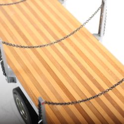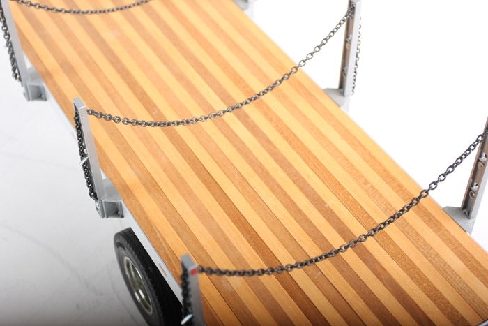 This highly realistic 1/14 scale flatbead semi-trailer model is for use in combination with Tamiya’s 1/14 scale R/C tractor trucks. A scale appearance is achieved by using authentic components such as aluminum chassis/frame, wood-floored platform and actual chains.