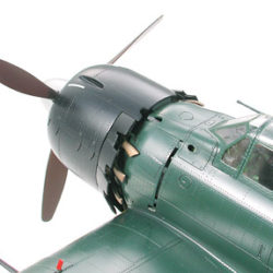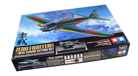 TAMIYA Mitsubishi A6M5 Zero Real Sound Action Set … LIMITED EDITION The masterfully designed 1/32 scale model of the A6M5 Zero shipboard fighter, with all its intricate detail and moveable parts has now been taken to the next level. Tamiya is proud to release a 1/32 scale model of the Mitsubishi A6M5 shipboard fighter that features realistic lights replicated with light emitting diodes, as well as propeller rotation coupled with synchronized engine sound. *Click on pictures below for enlargements and explanations. Images show painted and assembled kit. Just like the real thing, only smaller! To many Japanese, the Reisen (Zero Fighter) was more than a superbly designed aircraft, it was symbol of the legendary, albeit temporary invincibility of the Japanese Navy in the Pacific theater. Some theorists have even gone so far to say that if not for the design and production of the Zero fighter, the Japanese Navy would have never decided to initiate the Pacific War in the first place. The hope for Japanese victory in the Pacific against the might and sheer numbers of Allied aircraft rested on the Zero fighters and their pilots. Now, with Tamiya’s Zero Fighter (Zeke) Sound Action Set the thunderous roar of the Sakae 21 engine, having transcended time and space, can be heard in your very own living room. With the flick of a switch, the Zero’s story begins! A special control mechanism in the display stand enables simultaneous propeller rotation and engine sound to heighten the sense of realism. The propeller rotation and engine sound synchronization was recreated by referring to actual Zero fighter manuals. Flicking switch to “ON” position will engage sound of inertia starter rotation and connection, followed by idling sound, followed by warm-up running sound of engine, and finally full-go sound. This change of sound process has been precisely integrated with change in propeller speed. Turning switch off will cause engine sound to slowly wind down before stopping. Engine idling and warm-up running sounds may be continued. Designed with the utmost realism, the progression in propeller speed coincides with changes in engine sound. From initial rotation to full-go, the peak of propeller rotation speed portrays the state of the Zero during the moment before take-off, at the point when fighter pilots confirmed engine condition by focusing all their attention on the Sakae 21’s sound and vibration. The realistic sound and movement of this model stir the imagination and make it seem as if you are in the cockpit of a real Zero fighter. Sound recorded from actual Sakae 21 engine of a live Zero Fighter! Using digital technology, Tamiya designers recorded the engine sound of the only remaining Sakae 21 engine, housed in a Mitsubishi A6M5 on display at the Planes of Fame Aviation Museum located outside Los Angeles California. The sound of this Sakae 21 engine, with its 1130hp maximum output and a 2-speed control mechanism was recorded with the latest in digital sound technology to be played from the speaker box of the model’s display stand. Now all the power of the Sakae 21 engine can now be heard in your very own living room! About the Model ★A realistic scale model of the Mitsubishi A6M5 Zero Fighter, that features moving parts and sound. ★1/32 scale, fuselage length: 285mm, wingspan: 344mm. Display stand size: 285mm x 285mm x 40mm. ★Sound of real Sakae 21 Engine digitally recorded. ★Control mechanism and speaker box housed in display stand enable replication of start-up process of engine- from initial running to finish. Simultaneous propeller rotation and engagement of lights are also possible. ★Mini-motor encased in engine powers propeller rotation to synchronize with each phase of engine start-up. ★LED and optical fiber used to replicate tail, wing and fuselage lights. Model lights up in a total of 9 different places. ★Unpainted canopy parts come with pre-painted window frame parts. ★Kit requires four R14/C/UM2 batteries (sold separately)