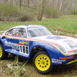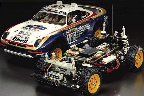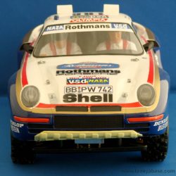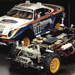 The concept of an “off-road” rally car was also a first for a long time. For the past few years, Tamiya had concentrated on true off-road buggies with big beefy suspension systems and buggy style bodies. The Porsche 959 changed all that, here was a cross over vehicle that was equally happy in parking lot races as it was in the dirt. Although Tamiya didn’t know it at the time, the Porsche 959 was a bit before its time as the popularity of touring cars today proves.