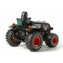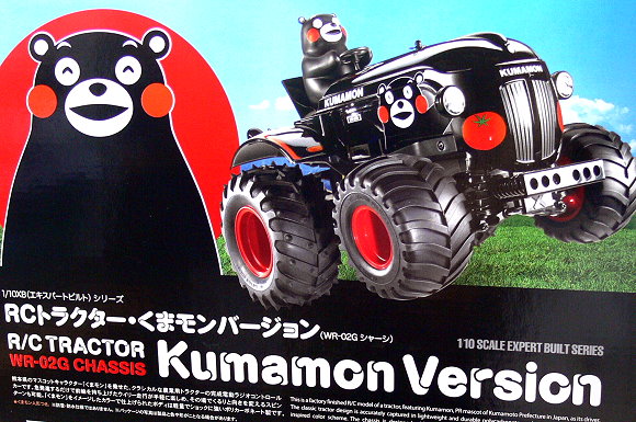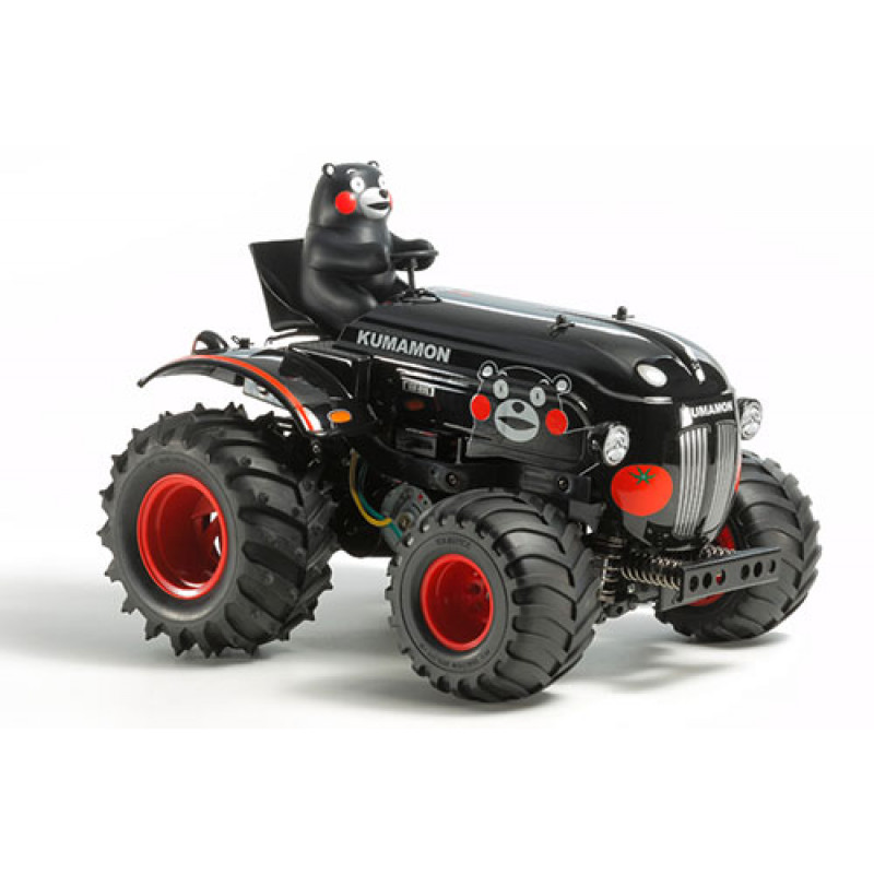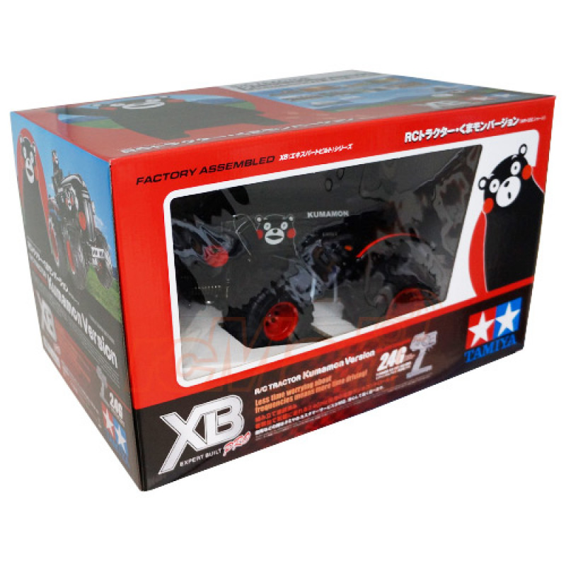 TAMIYA XB R/C Tractor Kumamon Version (WR-02G Chassis) A Factory Finished Model with a Special Driver! This is an R/C model assembly kit of a tractor with a very special driver – the popular Japanese mascot character Kumamon! The pre-painted polycarbonate body realistically captures the image of a classic farm tractor with stretched bonnet and large tires, and features a pre-painted Kumamon driver figure perched on the seat at the rear taking the steering wheel. Decals are applied adding a host of Kumamon- and Kumamoto-themed illustrations to the model. Features Red 97mm front and 130mm rear wheels. Fun wheelie action with the rear-wheel drive WR-02G! The rear wheel drive WR-02G chassis was made for rough riding! Shielded by side frames and held tightly in place by the monocoque frame, the fully-sealed gearbox is well-protected from impact. Power is provided to the rear wheels by a centrally-positioned motor, and transmitted via the differential in the gearbox. The location of the battery pack is key: its longitudinally-placed position high in the rear ensures that when the model accelerates, the front naturally rises in a wheelie. At that point, the wheelie bar on the model’s rear stops the model from toppling over, and in doing so maintains a great wheelie! Steering servo is placed along the center of the chassis, and combines with the 2-piece tie rod for precision steering. The suspension is of the tough 4-wheel double-wishbone variety. 2.4GHz Transmitter included In addition to the pre-painted and decorated body, this item also includes a wheel-type transmitter, battery pack and charger to allow instant enjoyment of driving. (*Battery pack and charger are included for Japan market only.) The 2.4GHz transmitter eliminates the need for frequency crystals, and is factory-paired with the receiver in the model to ensure that the receiver communicates with that transmitter only. Specifications ★Length: 345mm、Width: 253mm、Height: 235mm ★Wheelbase: 170mm ★Tread: 189mm (Front), 195mm (Rear) ★Tire Width/Diameter: 57/97mm (Front), 58/130mm (Rear) ★Resin Monocoque Frame ★Rear-Wheel 2WD ★4-Wheel Double Wishbone Suspension ★Front/Rear Friction Dampers ★2-Piece Steering Tie Rod ★3-Bevel Differentials ★Gear Ratio: 18.3:1 ★Type 540 Motor ★Requires an electronic speed controller (sold separately) ★Electronic Speed Controller (Forward/Reverse Type) Separately Required Items ★R6/AA/UM3 batteries for transmitter