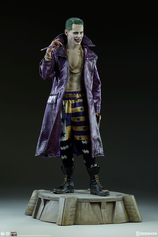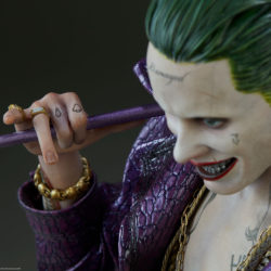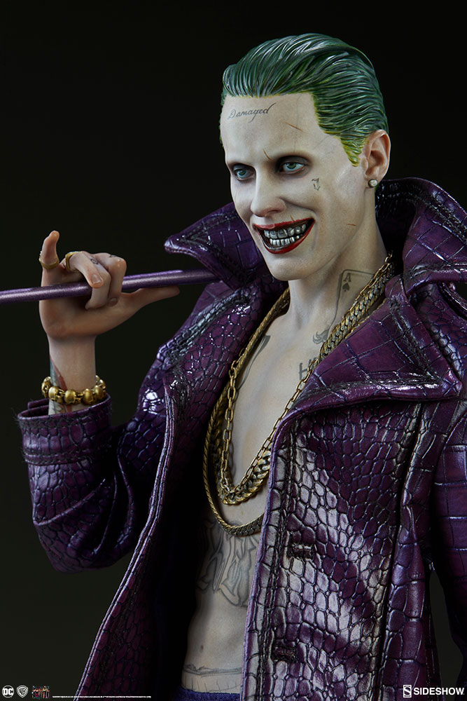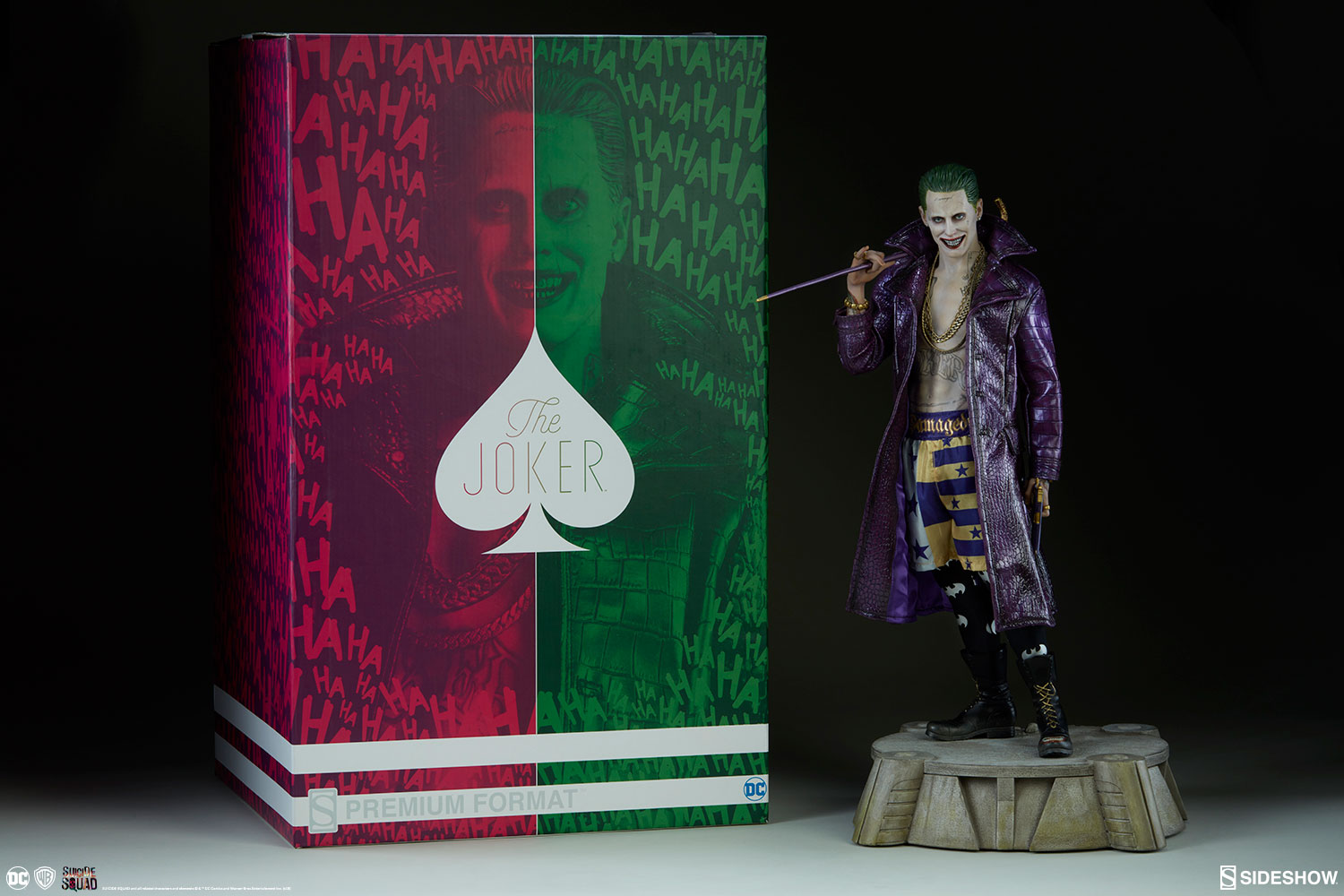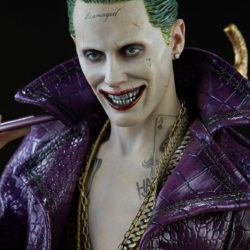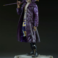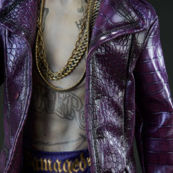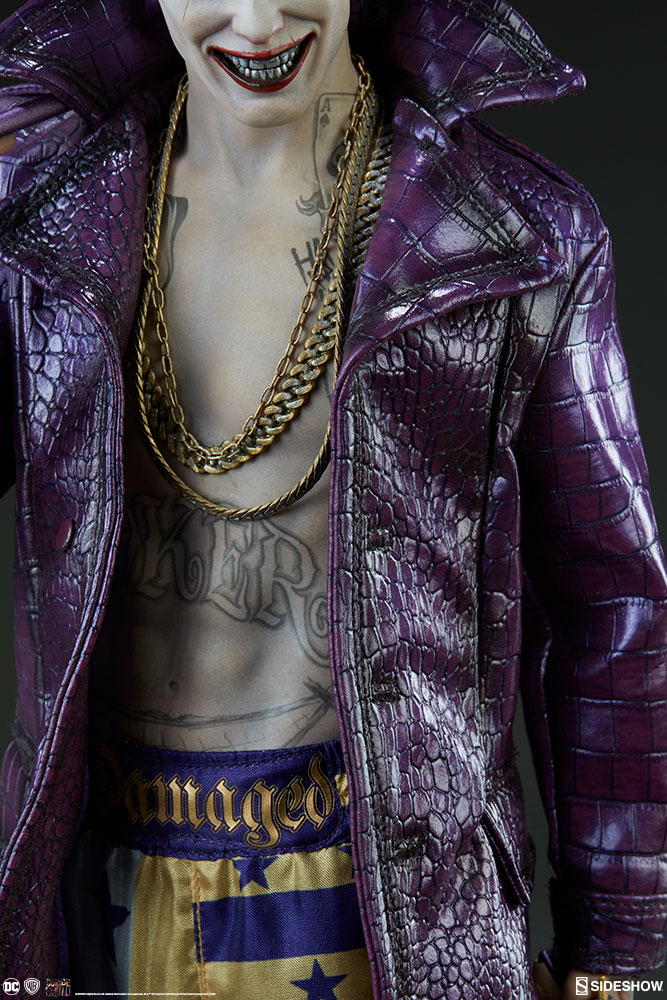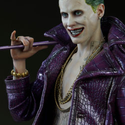 About This Premium Format™ Figure “If you weren’t so crazy, I’d think you were insane.” Sideshow is proud to present The Joker Premium Format Figure, based on Jared Leto’s memorable, maniacal performance in the DC film Suicide Squad. The Joker is ready to strut his stuff as the reigning criminal kingpin of Gotham. Holding a jeweled cane over his shoulder and a gun at his side, the Clown Prince of Crime has stepped straight from his on-screen appearance to take center stage. The Joker has an eye for flair, decked out in rings, chains, and even his silver grills in that vicious grin of his. A variety of detailed tattoos brand the man from head to toe as a dangerous deviant who is not to be trifled with. The Joker Premium Format Figure features mixed media elements, sporting a tailored purple faux-alligator coat, purple and gold fabric boxers, and Batman-themed leggings. The Exclusive edition of The Joker Premium Format Figure includes a swap-out hand holding a razor knife because this guy’s a real cut-up! He’ll put a smile on your face, no matter what. Pair The Joker with the Harley Quinn Premium Format Figure from Suicide Squad and reunite the ultimate partners in crime, complete with matching bases. He’s ready to squad up with any DC display- do you think you can handle the insanity? Add The Joker Premium Format Figure to your collection today! Brand DC Comics Manufacturer Sideshow Collectibles Type Premium Format™ Figure Artists Bernardo Esquivel (Paint) Jean-Paul Mavinga (Design) Tim Hanson (Costume Fabrication) Esther Skandunas (Costume Fabrication) Zac Roane (Design) Katie Fernandez (Costume Fabrication) Matt Black Mike Allen Dave Kawano The Sideshow Design and Development Team Videos Watch Unboxing Video The Joker Premium Format Figure Additional Details & Dimensions Materials Polystone Product Size Height: 21.5″ (546.1 mm) | Width: 14″ (355.6 mm) | Depth: 13″ (330.2 mm) | Weight: 10.00 lbs (4.54 kg) * Box Size Height: 15.00″ (381 mm) | Width: 16.00″ (406.4 mm) | Depth: 25.00″ (635 mm) | * Dimensional Weight 27.00 lbs (12.25 kg) [Intl. 37.00 lbs (16.78 kg)] *