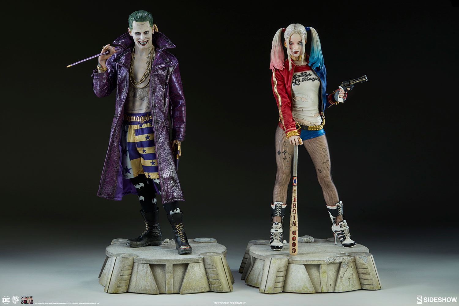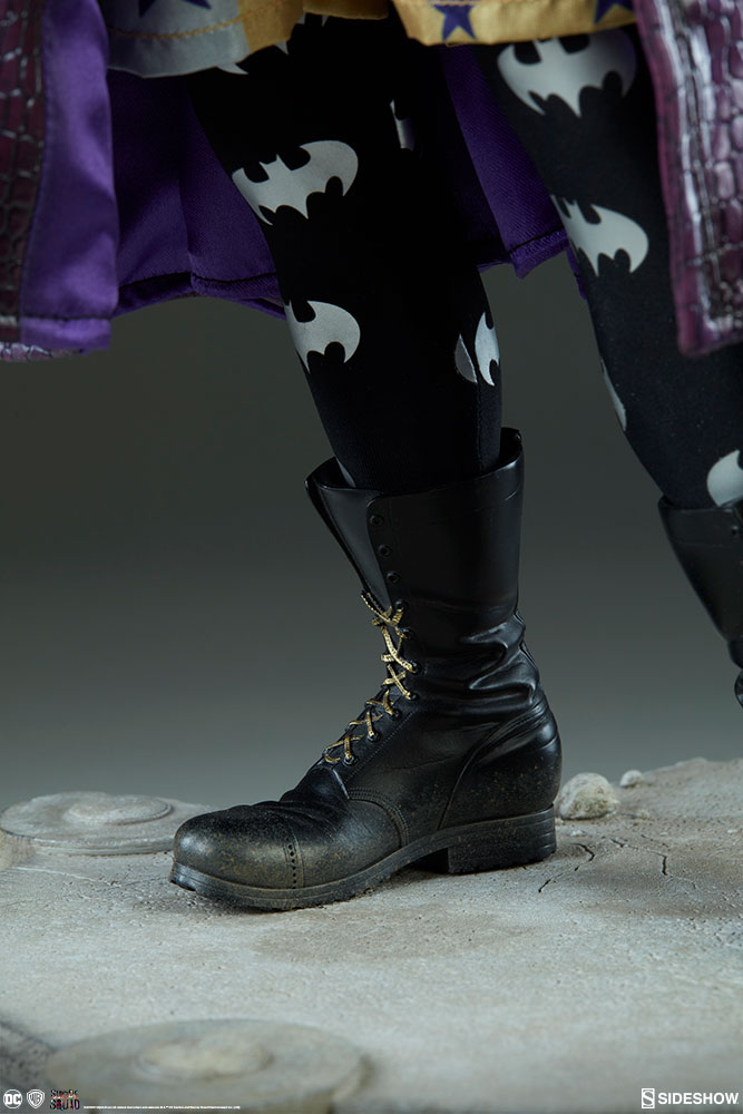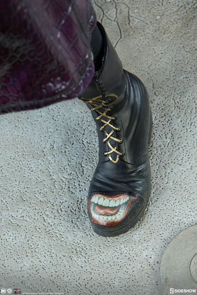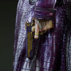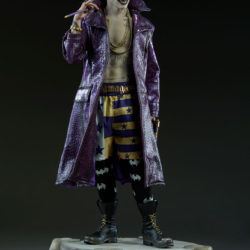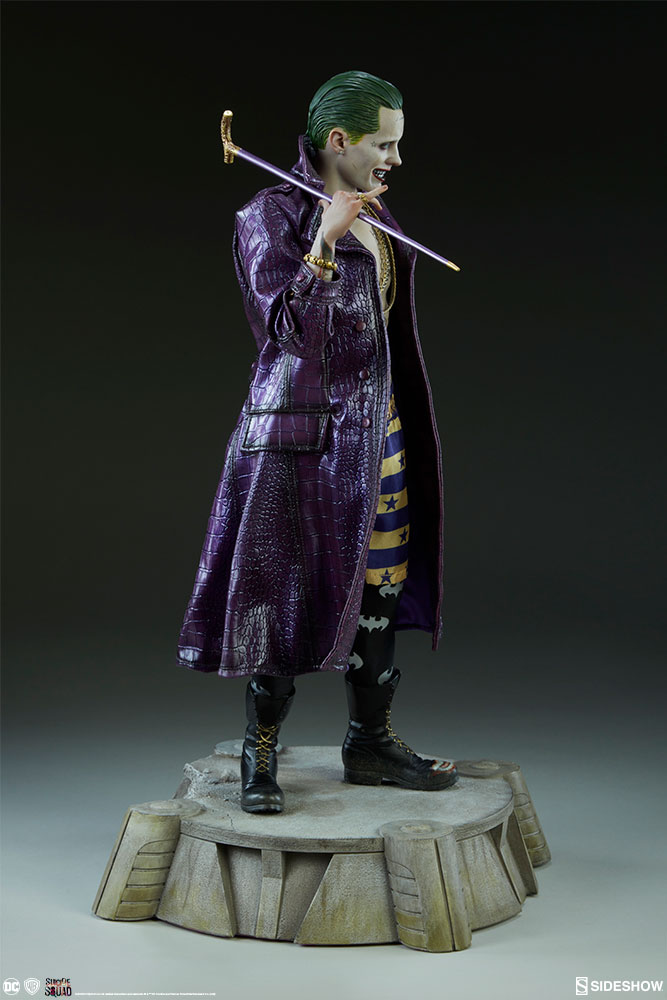 About This Premium Format™ Figure “If you weren’t so crazy, I’d think you were insane.” Sideshow is proud to present The Joker Premium Format Figure, based on Jared Leto’s memorable, maniacal performance in the DC film Suicide Squad. The Joker is ready to strut his stuff as the reigning criminal kingpin of Gotham. Holding a jeweled cane over his shoulder and a gun at his side, the Clown Prince of Crime has stepped straight from his on-screen appearance to take center stage. The Joker has an eye for flair, decked out in rings, chains, and even his silver grills in that vicious grin of his. A variety of detailed tattoos brand the man from head to toe as a dangerous deviant who is not to be trifled with. The Joker Premium Format Figure features mixed media elements, sporting a tailored purple faux-alligator coat, purple and gold fabric boxers, and Batman-themed leggings. The Exclusive edition of The Joker Premium Format Figure includes a swap-out hand holding a razor knife because this guy’s a real cut-up! He’ll put a smile on your face, no matter what. Pair The Joker with the Harley Quinn Premium Format Figure from Suicide Squad and reunite the ultimate partners in crime, complete with matching bases. He’s ready to squad up with any DC display- do you think you can handle the insanity? Add The Joker Premium Format Figure to your collection today! Brand DC Comics Manufacturer Sideshow Collectibles Type Premium Format™ Figure Artists Bernardo Esquivel (Paint) Jean-Paul Mavinga (Design) Tim Hanson (Costume Fabrication) Esther Skandunas (Costume Fabrication) Zac Roane (Design) Katie Fernandez (Costume Fabrication) Matt Black Mike Allen Dave Kawano The Sideshow Design and Development Team Videos Watch Unboxing Video The Joker Premium Format Figure Additional Details & Dimensions Materials Polystone Product Size Height: 21.5″ (546.1 mm) | Width: 14″ (355.6 mm) | Depth: 13″ (330.2 mm) | Weight: 10.00 lbs (4.54 kg) * Box Size Height: 15.00″ (381 mm) | Width: 16.00″ (406.4 mm) | Depth: 25.00″ (635 mm) | * Dimensional Weight 27.00 lbs (12.25 kg) [Intl. 37.00 lbs (16.78 kg)] *