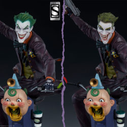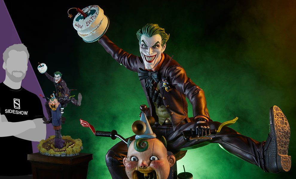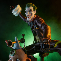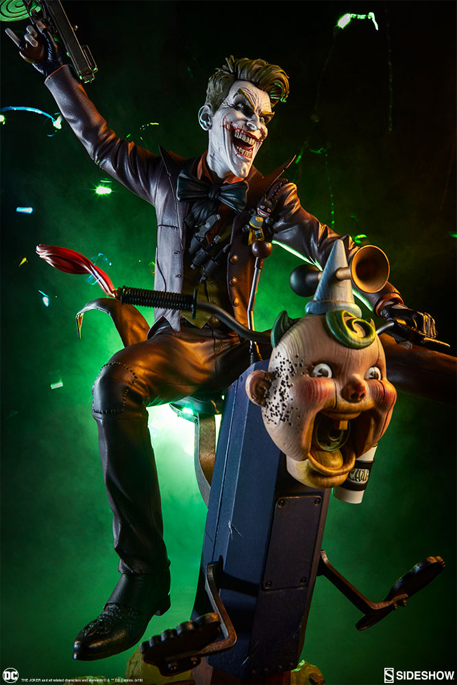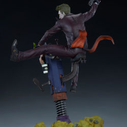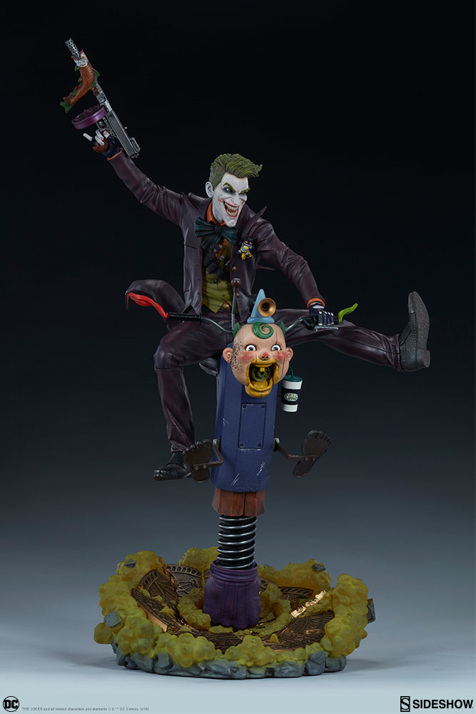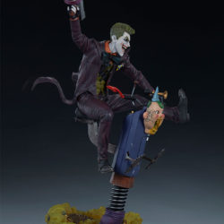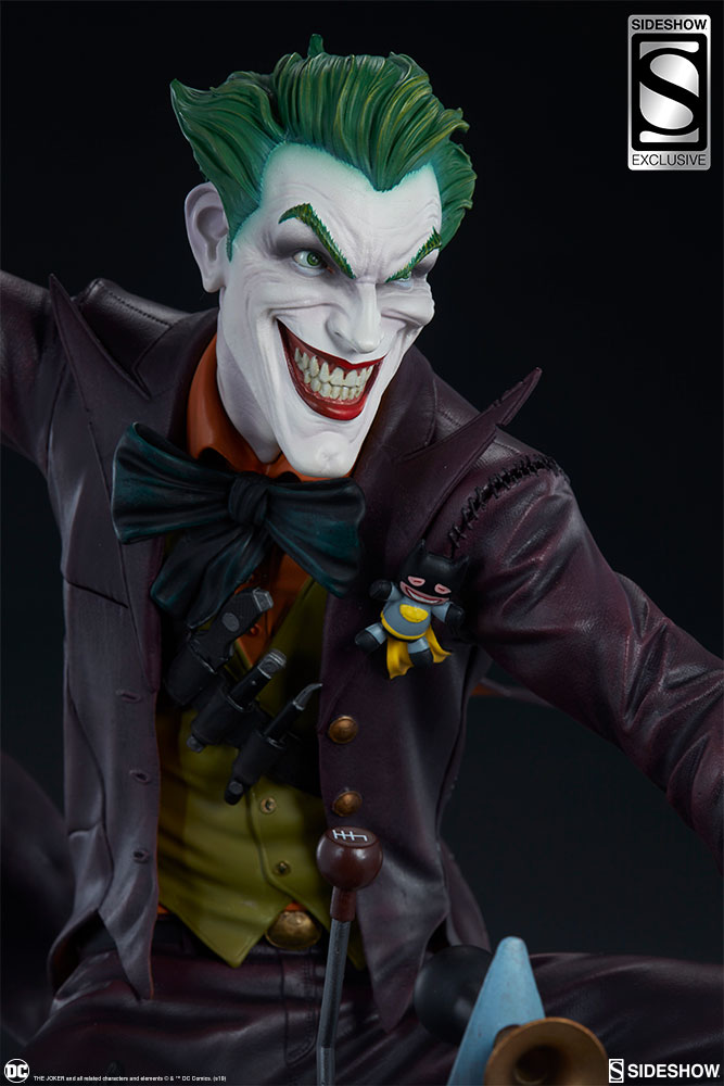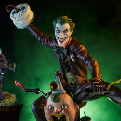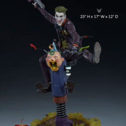 About This Premium Format™ Figure “All I’ve ever wanted is to have a good time…and to annoy Batman whenever possible, of course.” Sideshow is proud to present The Joker Premium Format™ Figure, making mayhem for Gotham wherever he goes. The key to humor is a good punch line- The Joker measures 25” tall atop a pogo-fist base inspired by his own suit sleeve, fitted with a dilapidated carnival game head. A giant purple glove is breaking the Gotham courthouse Seal of Justice, while his patented toxic laughing gas leaks from the wreckage. A Batusi 8-track hides on the control panel of The Joker’s crazy contraption along with a carved heart with H+J as a symbol of their mad love. Bouncing into battle, the Clown Prince of Crime comes equipped with a Joker Fish tommy gun to put the fin-ishing touches on his elaborate scheme. The Joker has a maniacal, scarred portrait with his iconic face makeup and coiffed green hair, and a sculpted purple two-piece suit, green vest, and orange shirt. His suit is outfitted with intricate stitching details as well as a grinning Batgirl plush pinned to his lapel. Always playing the heel to Batman’s heroic antics, The Joker has a custom pair of shoes with ‘Ha!’ treads and a “Your Face Here” on the soles. Give Batman the ol’ one-two punch when you pair The Joker with his best girl, the Harley Quinn Premium Format™ Figure. Gotham will never know what hit them! The Exclusive edition of The Joker Premium Format™ Figure includes an alternate classic portrait of the Clown Prince of Crime, as well as a swap-out right hand holding a special cake for Batman. These accessories can be swapped out independently of one another, giving you additional display options. Joke’s on you! Start clowning around and add The Joker Premium Format™Figure to your DC collection today. Brand DC Comics Manufacturer Sideshow Collectibles Type Premium Format™ Figure Artists Matt Black (Sculpt) Martin Canale (Sculpt) Alejandro Pereira (Sculpt) Ian MacDonald (Design) Alex Pascenko (Design) Adam Smith (Mold and Cast) Kat Sapene (Paint) Zac Roane (Design) Additional Details & Dimensions Materials Polyresin Product Size Height: 25″ (635 mm) | Width: 17″ (431.8 mm) | Depth: 12″ (304.8 mm) | Weight: 14.00 lbs (6.35 kg) * Box Size Height: 15.00″ (381 mm) | Width: 23.00″ (584.2 mm) | Depth: 31.00″ (787.4 mm) | * Dimensional Weight 47.00 lbs (21.32 kg) [Intl. 65.00 lbs (29.48 kg)] * * Size and weight are approximate values. Learn more