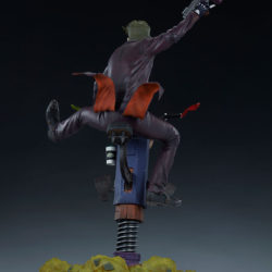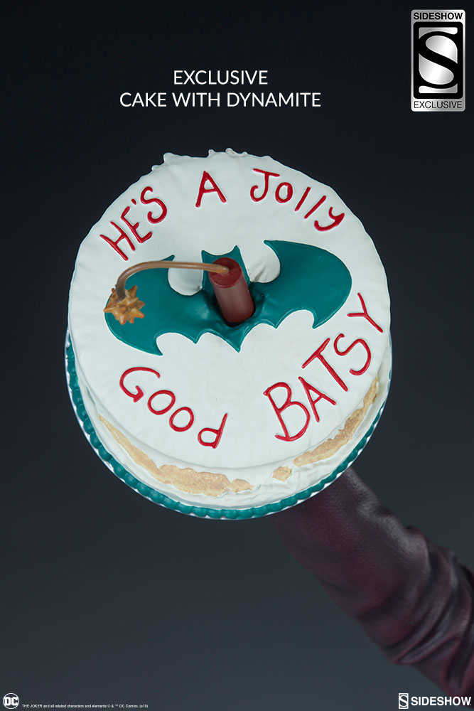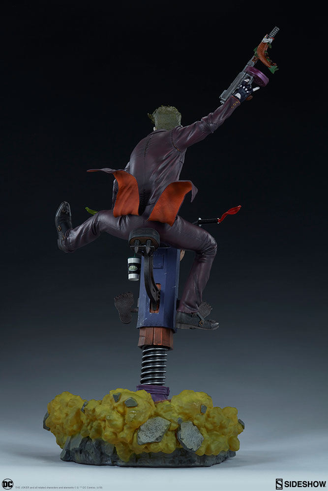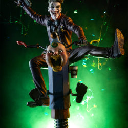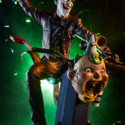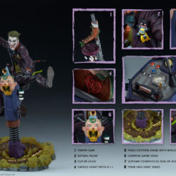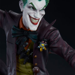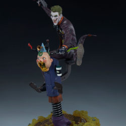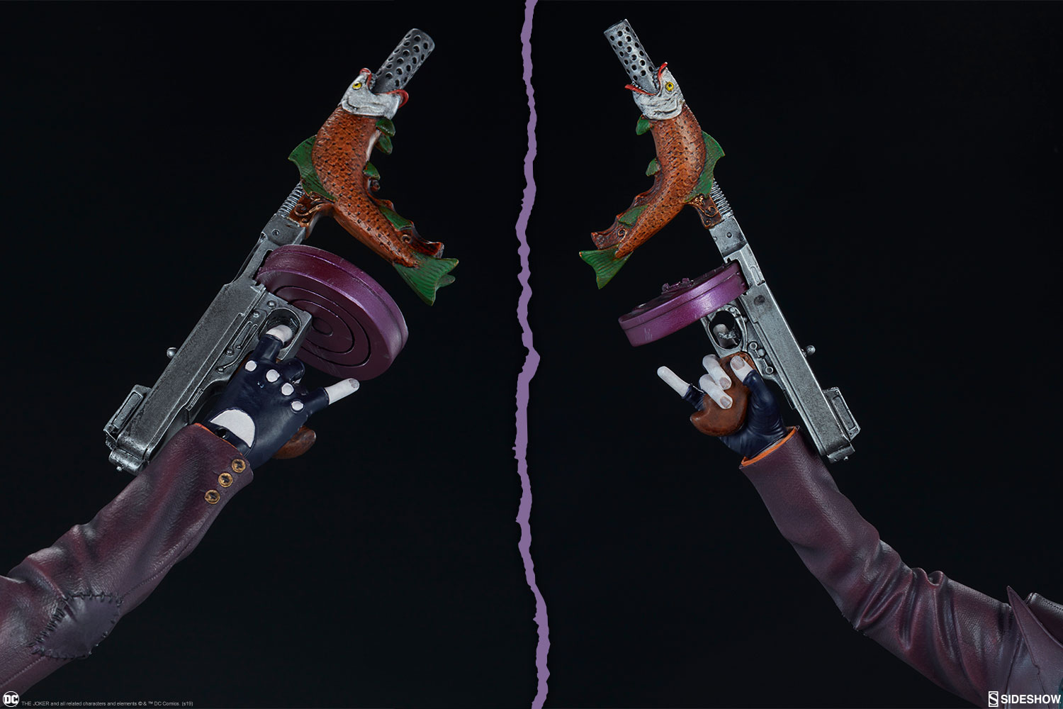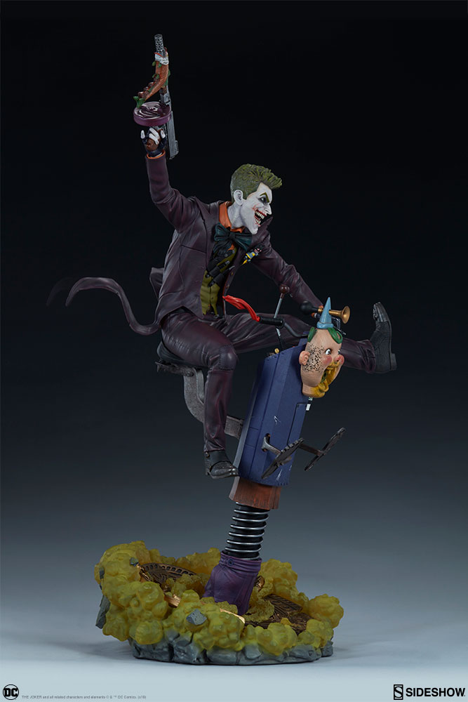 About This Premium Format™ Figure “All I’ve ever wanted is to have a good time…and to annoy Batman whenever possible, of course.” Sideshow is proud to present The Joker Premium Format™ Figure, making mayhem for Gotham wherever he goes. The key to humor is a good punch line- The Joker measures 25” tall atop a pogo-fist base inspired by his own suit sleeve, fitted with a dilapidated carnival game head. A giant purple glove is breaking the Gotham courthouse Seal of Justice, while his patented toxic laughing gas leaks from the wreckage. A Batusi 8-track hides on the control panel of The Joker’s crazy contraption along with a carved heart with H+J as a symbol of their mad love. Bouncing into battle, the Clown Prince of Crime comes equipped with a Joker Fish tommy gun to put the fin-ishing touches on his elaborate scheme. The Joker has a maniacal, scarred portrait with his iconic face makeup and coiffed green hair, and a sculpted purple two-piece suit, green vest, and orange shirt. His suit is outfitted with intricate stitching details as well as a grinning Batgirl plush pinned to his lapel. Always playing the heel to Batman’s heroic antics, The Joker has a custom pair of shoes with ‘Ha!’ treads and a “Your Face Here” on the soles. Give Batman the ol’ one-two punch when you pair The Joker with his best girl, the Harley Quinn Premium Format™ Figure. Gotham will never know what hit them! The Exclusive edition of The Joker Premium Format™ Figure includes an alternate classic portrait of the Clown Prince of Crime, as well as a swap-out right hand holding a special cake for Batman. These accessories can be swapped out independently of one another, giving you additional display options. Joke’s on you! Start clowning around and add The Joker Premium Format™Figure to your DC collection today. Brand DC Comics Manufacturer Sideshow Collectibles Type Premium Format™ Figure Artists Matt Black (Sculpt) Martin Canale (Sculpt) Alejandro Pereira (Sculpt) Ian MacDonald (Design) Alex Pascenko (Design) Adam Smith (Mold and Cast) Kat Sapene (Paint) Zac Roane (Design) Additional Details & Dimensions Materials Polyresin Product Size Height: 25″ (635 mm) | Width: 17″ (431.8 mm) | Depth: 12″ (304.8 mm) | Weight: 14.00 lbs (6.35 kg) * Box Size Height: 15.00″ (381 mm) | Width: 23.00″ (584.2 mm) | Depth: 31.00″ (787.4 mm) | * Dimensional Weight 47.00 lbs (21.32 kg) [Intl. 65.00 lbs (29.48 kg)] * * Size and weight are approximate values. Learn more