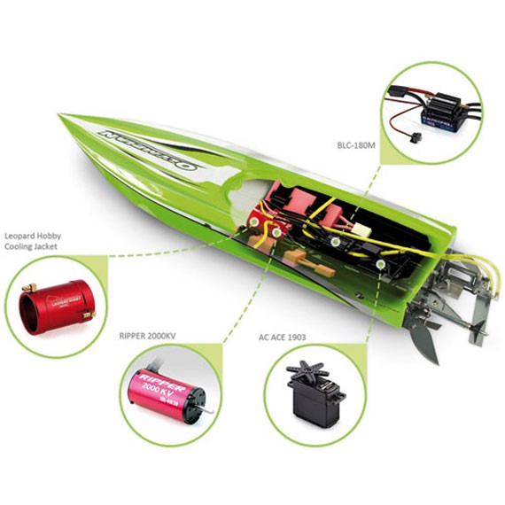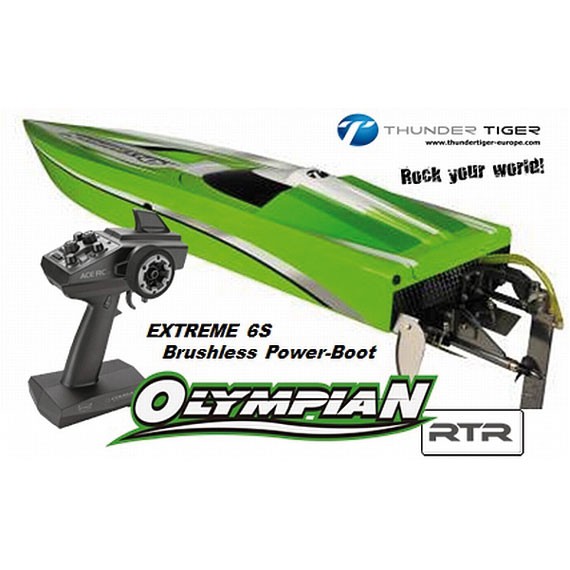THUNDER TIGER OLYMPIAN Ready to Run Boat Feature Advanced 2.4 GHz frequency hopping spread spectrum technology Steering Throttle trims/servo reversing Throttle/Broke ATV-adjustable travel volume Steering dual-rate adjustment Led battery voltage indicator Low battery alarm •Factory Assembled & RTR •Blow Molded One-piece Vee-hull •Quick-release Magnetic Hatch •Dual Water Pickup/Outlet for Effective Cooling •Quick- remove Power Unit for Easy Maintenance •Upgraded CNC Adjustable Strut/ Trim tab/ Turn Fins •Length: 39.1” (994mm) •Height: 13.7” (349mm) •Beam: 10.6” (268mm) .Dry Weight: 5.3lb (2400g) •Motor: Water-cooled 2000KV IBL-40/20 •ESC: BLC-180M •Radio: COUGAR GP3 2.4GHz included •Battery: Two 3S1P 11.1V 30~40C 3300~4500mAh (Required)